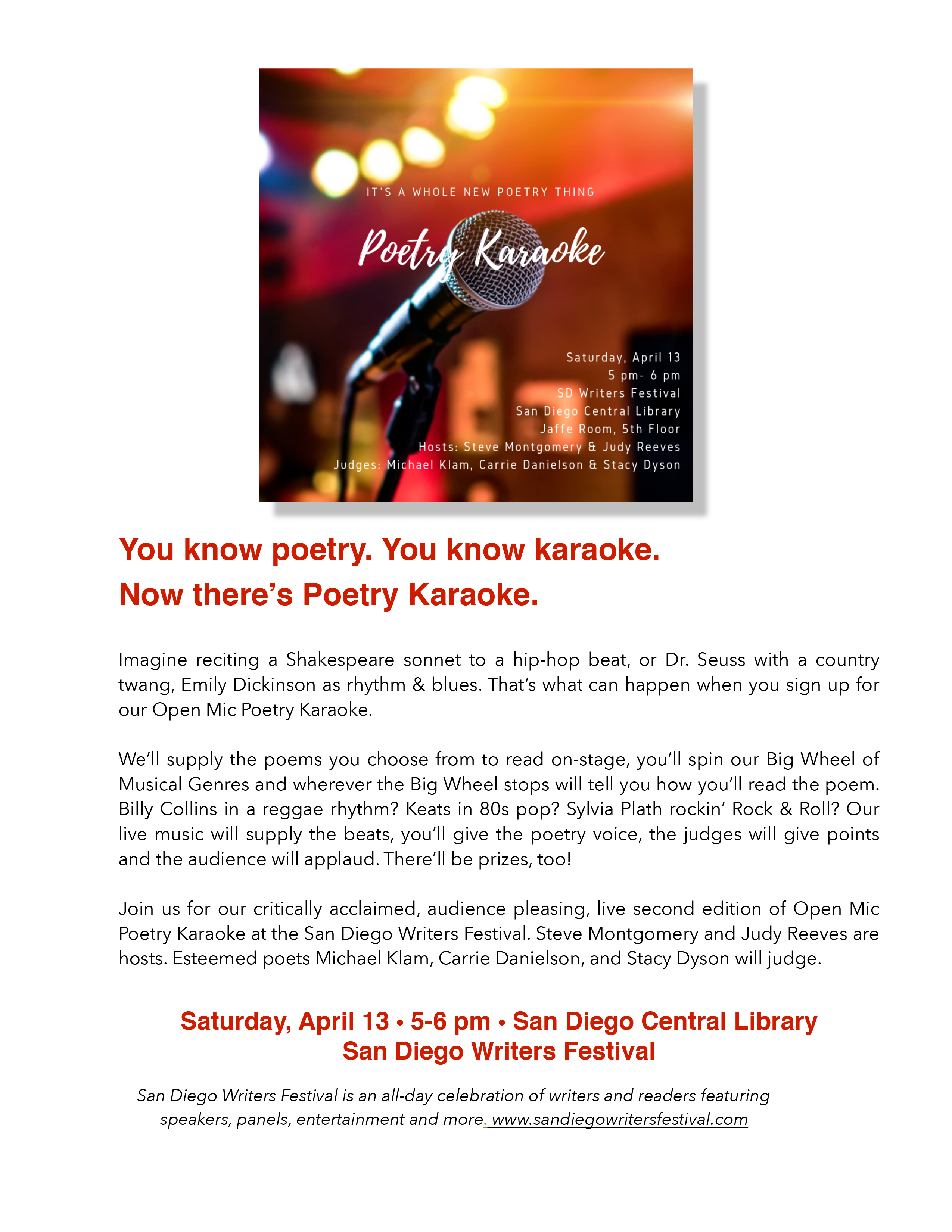 Poetry Karaoke is back on April 13 at San Diego Writers Festival! Check out the details from host Judy Reeves.