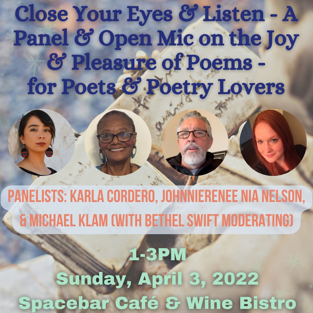 Sunday, April 3, at 1 p.m., author and organizer Bethel Swift hosts Close Your Eyes and Listen poetry panel (with authors JohnnieRenee Nia Nelson, Karla Cordero, yours truly) and open mic at Spacebar. All the details here.