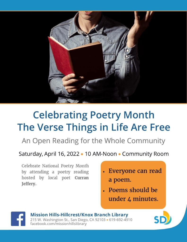 Saturday, April 16th, at 10 a.m., The Friends of the Mission Hills Library sponsors, and poet Curran Jeffery hosts an SDPA authors poetry reading and open mic. All poets from the SDPA are invited to read their poem in the annual. All poetry aficionados and poets welcome to participate.