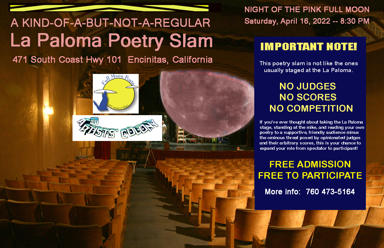 Saturday, April 16, at 8:30 pm.: Poetry Slam at the La Paloma Theatre. Check this out: No judges, scores or competition, just spoken word for the joy of poetry! Home and Away restaurant and bar is right next to the theater. 101 Artists’ Colony and Full Moon Poets: 760 473-5164.