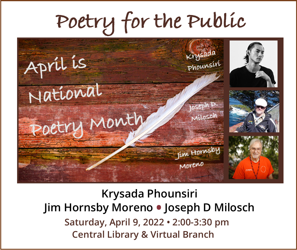 Saturday, April 9 at 2 p.m. at Central Library: To celebrate National Poetry Month, the Friends of Central Library is hosting three of San Diego’s most notable poets who have published a book in 2021. Come join us for a diverse selection of readings, to be followed with a book signing and Q & A with the audience. Authors: Krysada Phounsiri – every passing minute; Joseph D. Milosch & Jim Hornsby Moreno – Poems That Speak to Us: Selected Poems of Steve Kowit.