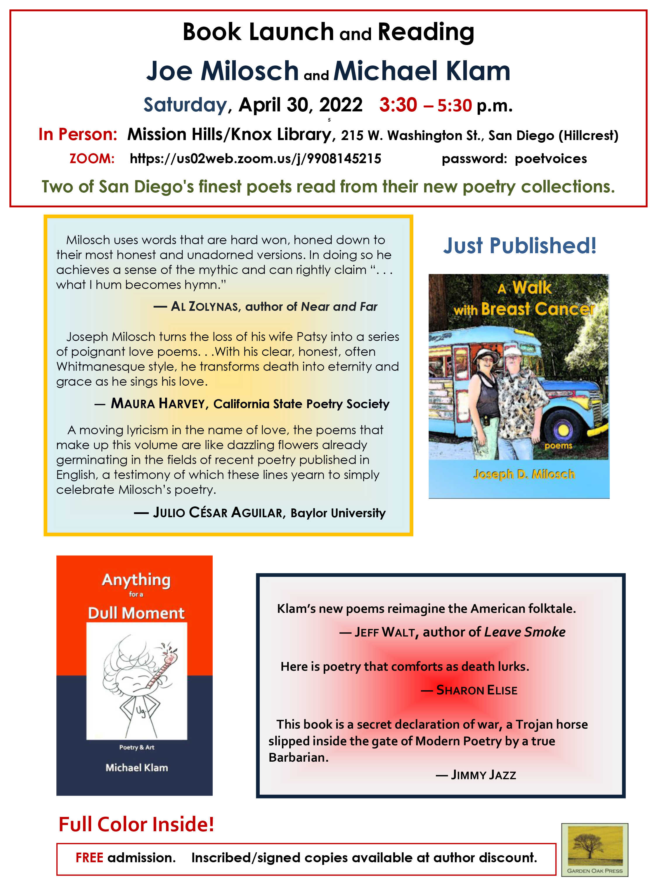 I’m looking forward to two readings coming up soon featuring Joe Milosch (and Jim Moreno supporting on Zoom and hosting at Mission Hills Library and Spacebar). Find details on the flier for Mission Hills and see text below for Spacebar: