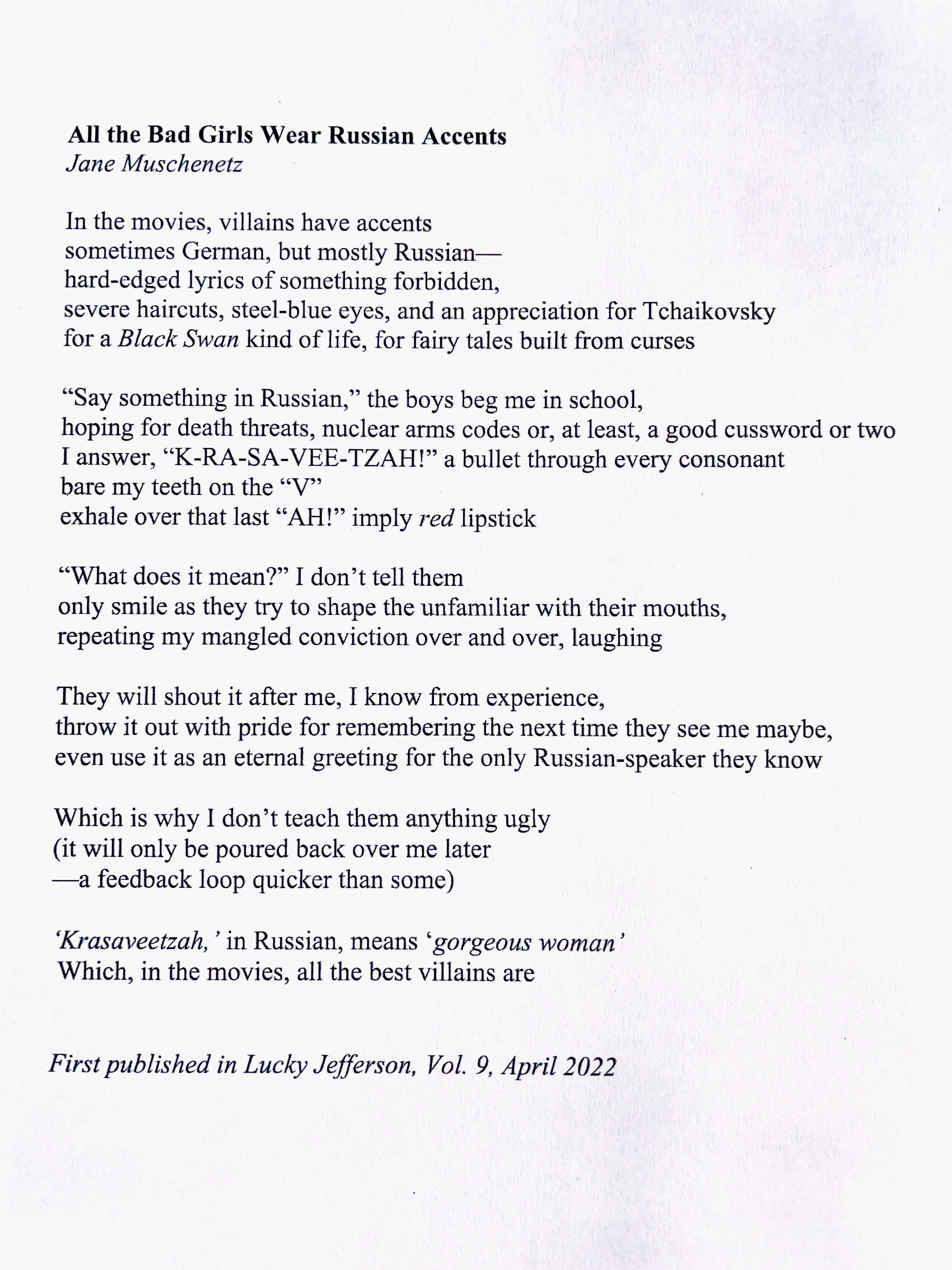 “All the Bad Girls Wear Russian Accents” was first published in Lucky Jefferson, Vol. 9, April 2022. Click or zoom to read: