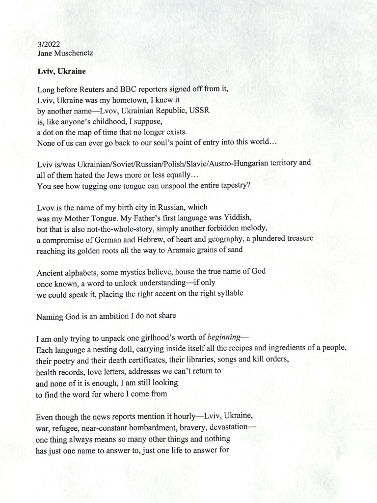 Ukrainian-born, Russian-speaking Jew, Jane (Yevgenia!) Muschenetz was granted asylum as a refugee to the U.S. at 10 years old. Today, she is a fully-grown MIT nerd, mother, emerging artist and writer. Her first poetry chapbook, All the Bad Girls Wear Russian Accents, was recently accepted for publication by Kelsay Books and releases in January of 2023. Connect with Jane’s work at her website, PalmFrondZoo.com, and various publications, including San Diego Poetry Annual, Meat for Tea and Lucky Jefferson.
