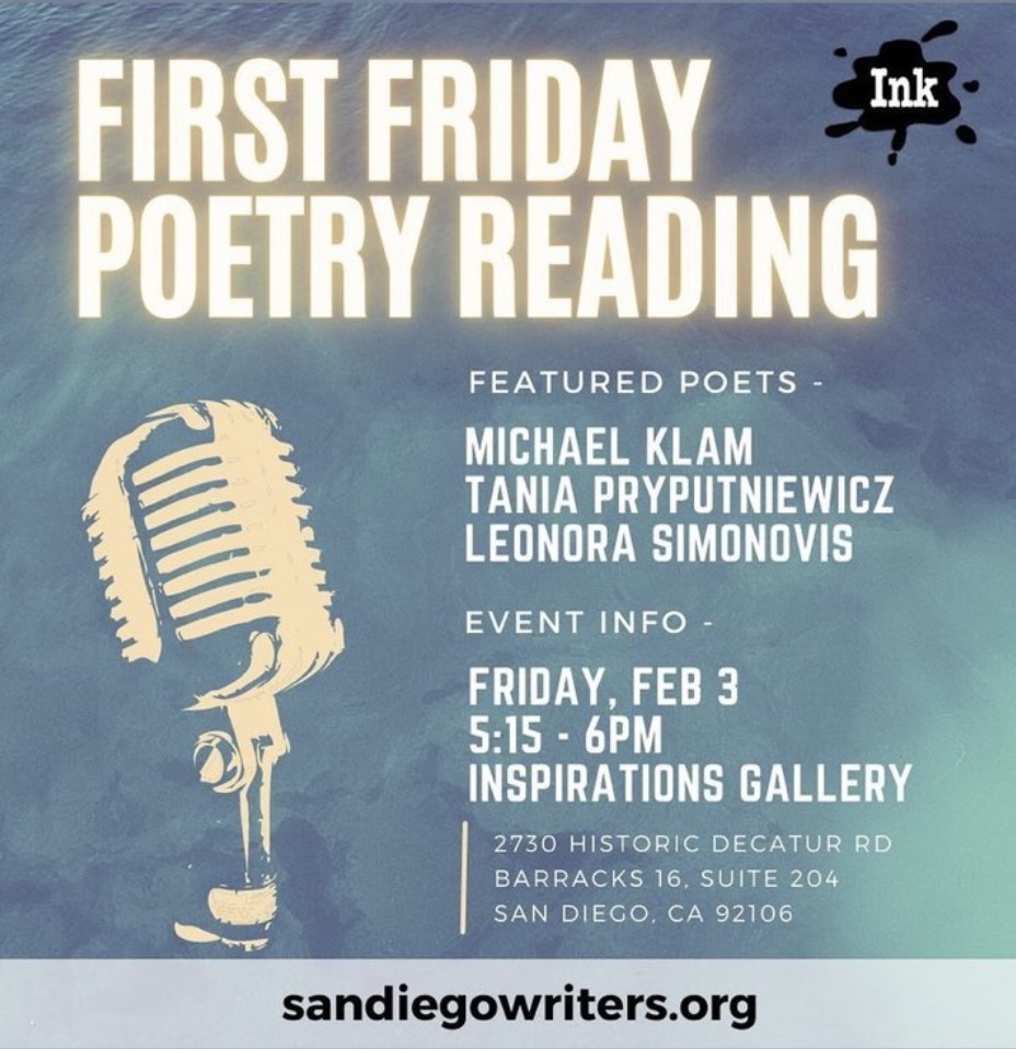 Over the moon to be reading with Tania Pryputniewicz and Leonora Simonovis in person this afternoon, Fri., Feb. 3 @ 5:15, at Inspirations Gallery for SDWI’s First Friday Poetry Reading. Come, come! All the details here: