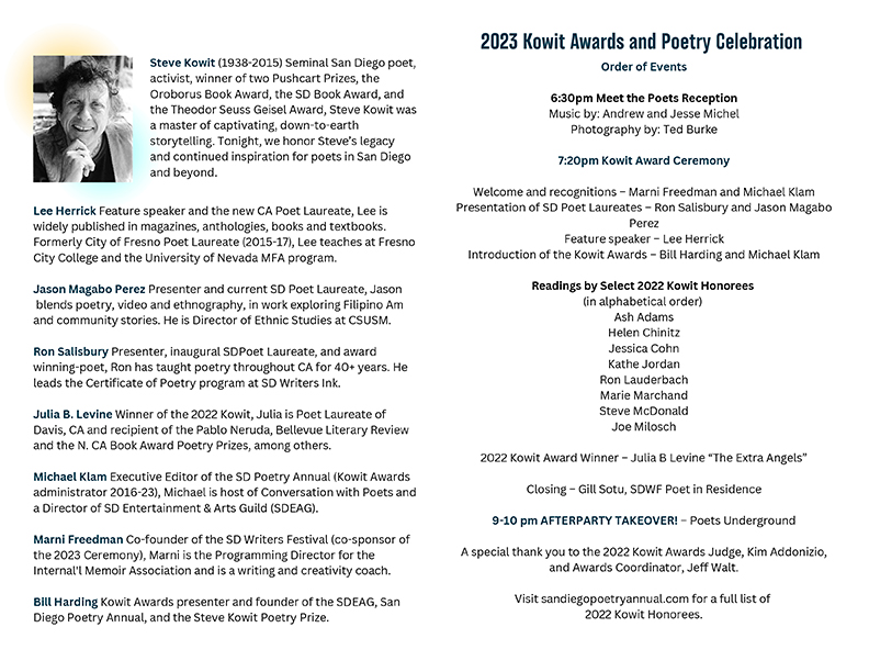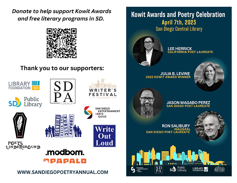 Friday, Apr 7 @ 6:30: Meet California Poet Laureate Lee Herrick and San Diego’s new Poet Laureate, Jason Magabo Perez. The poets laureate will be on hand at Central Library for The Steve Kowit Poetry Prize Ceremony. Register HERE. Details: Instagram @sdpoetryannual and SDPA website. Want to read? After-party poetry takeover open reading info: Poets Underground.